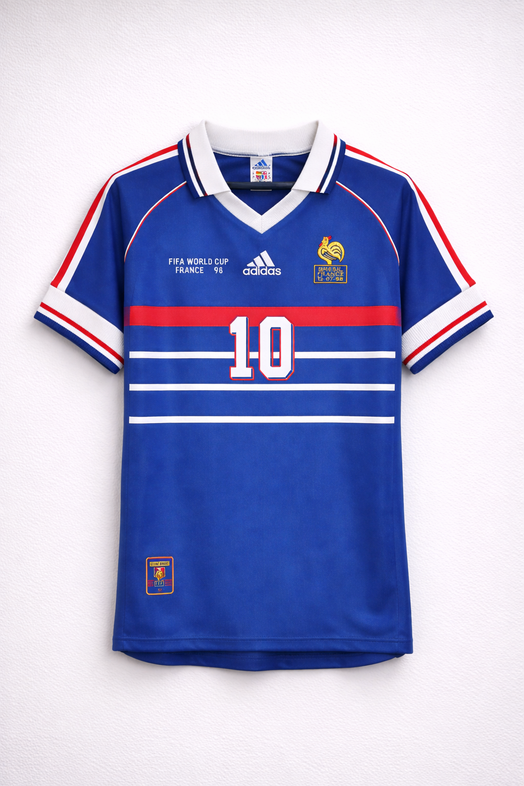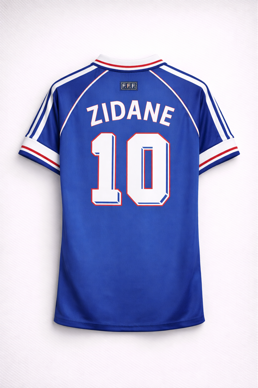 El diseño clásico en azul profundo, con detalles en rojo y blanco que representan los colores de la bandera francesa, refleja la elegancia y poder que caracterizaban a aquella generación histórica. El dorsal 10 en la parte posterior simboliza liderazgo, talento y visión de juego, atributos que definieron a Zidane durante todo el torneo.