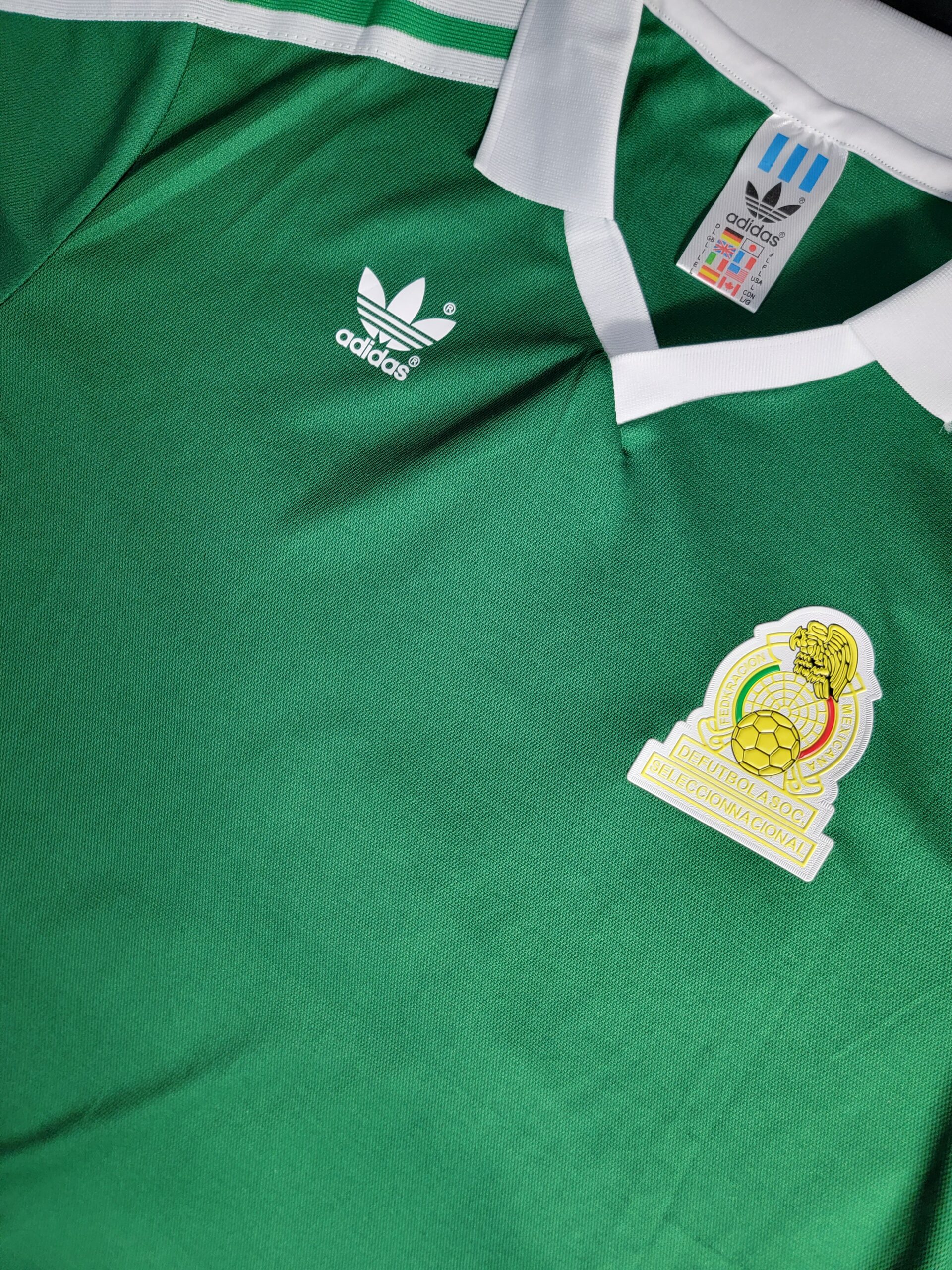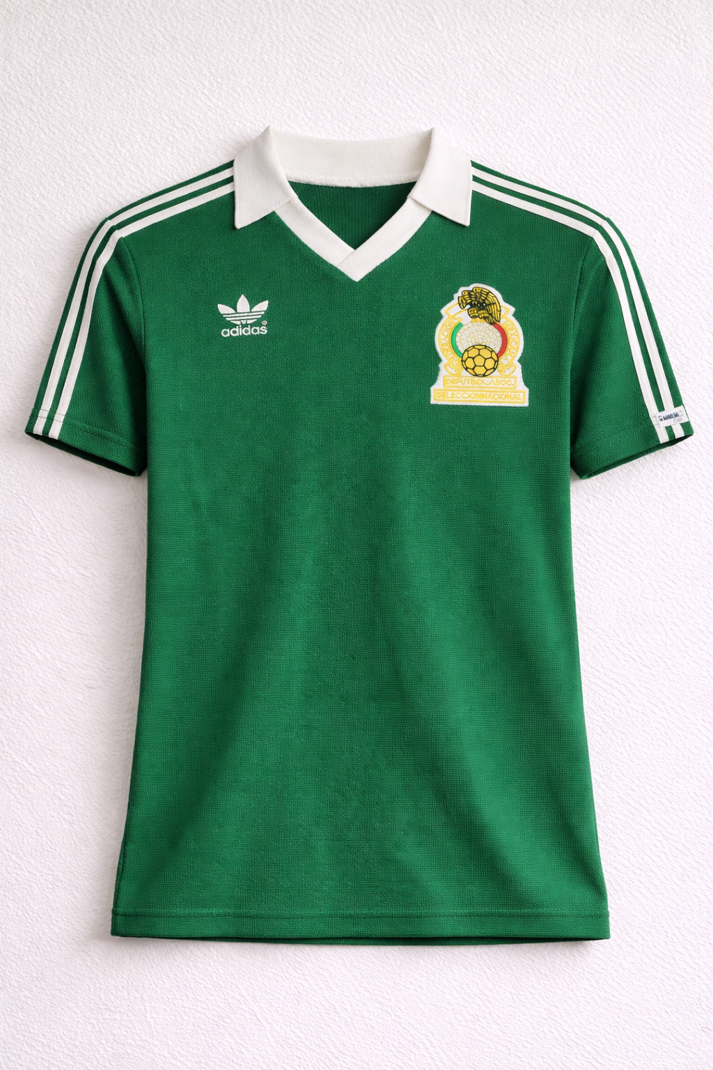 El diseño mantiene la esencia vintage de los años 80, con un corte recto masculino, ajuste clásico y una silueta plana que respeta el estilo original de la época. El escudo tradicional de la Federación Mexicana de Fútbol bordado al pecho le da ese toque auténtico que todo coleccionista y verdadero aficionado valora.